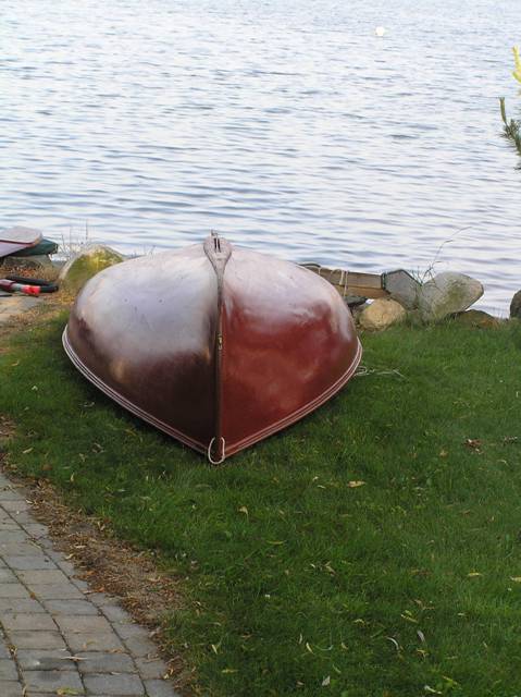 1/4″ cedar stripped, 6oz fiberglass cloth, steamed white oak ribs, white pine seats.