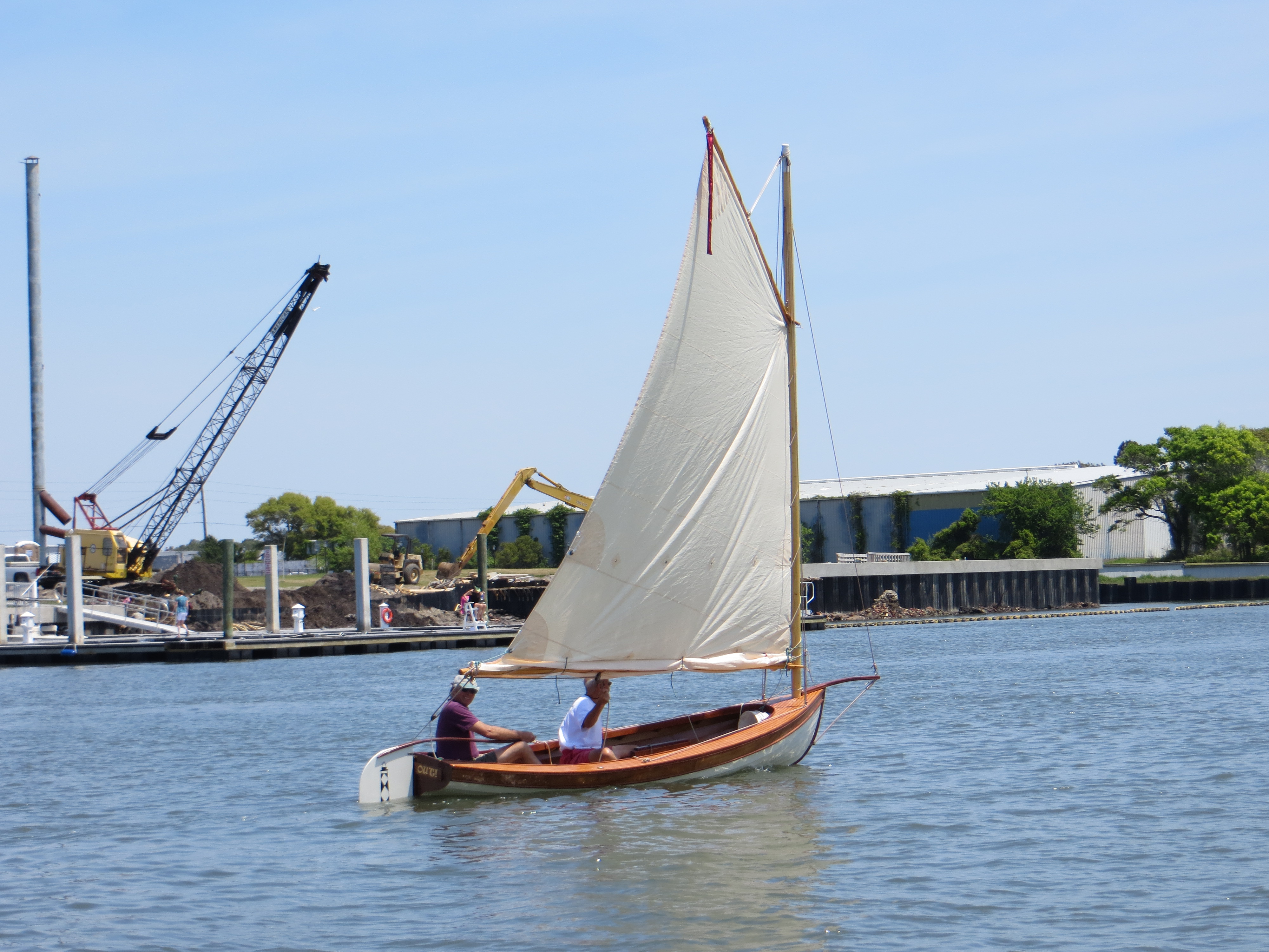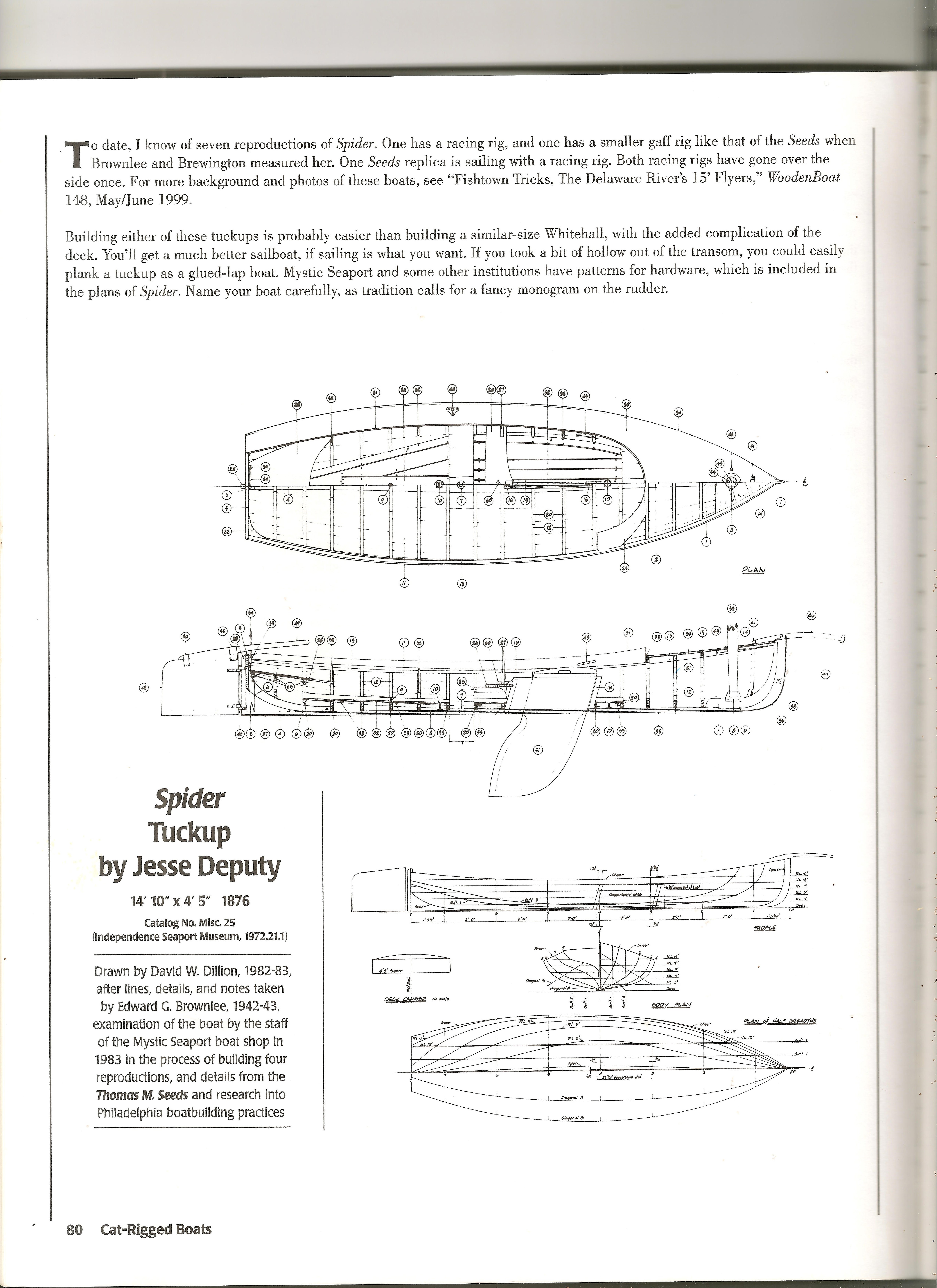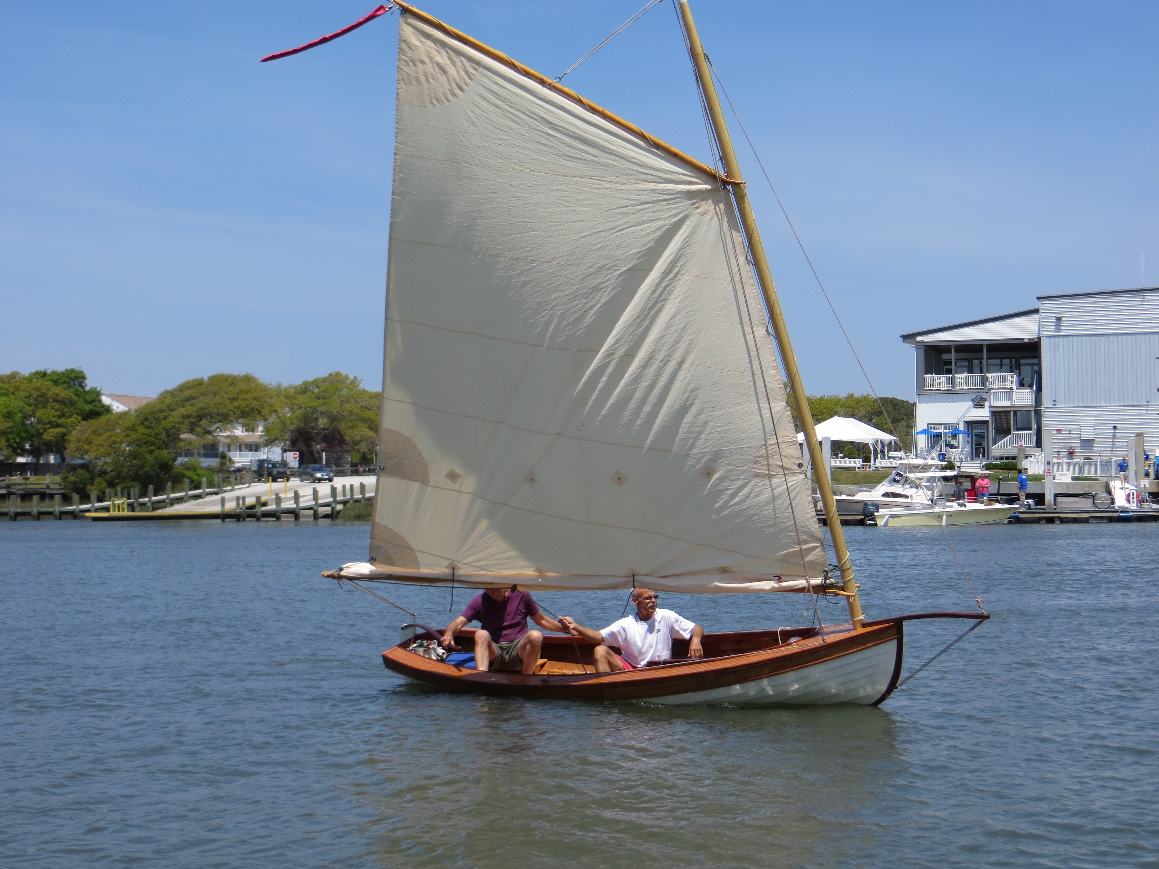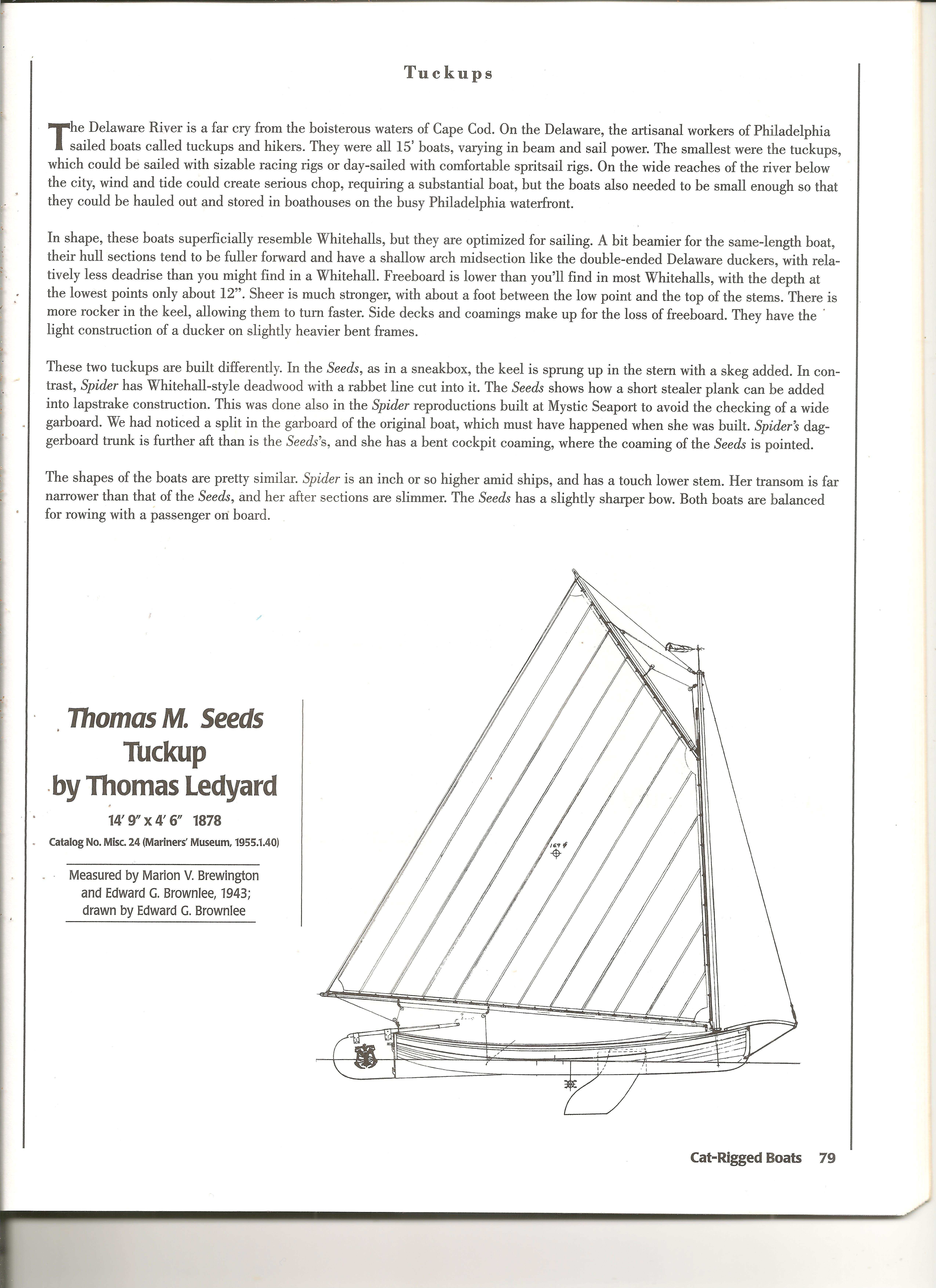 This boat is well described in “87 Boat designs” by Benjamin Fuller. The article is at the bottom of this page and fully describes these incredibly unique, fast and fun boats! These were built in Philadelphia and raced on Delaware Bay by the builders Themselves on Sunday afternoons. The design has a huge amount of sale for the relatively small boat size. I built it with the specified 160 sq ft of sail and it is very, very lively!! I am working on a reduced amount of sail so the boat is swamped less often! Notice the large sail (already reefed!) and lively performance in these initial pictures. You can also learn more about “Tuck-ups” here: http://traditionalsmallcraft.com/Tuckups/index.html