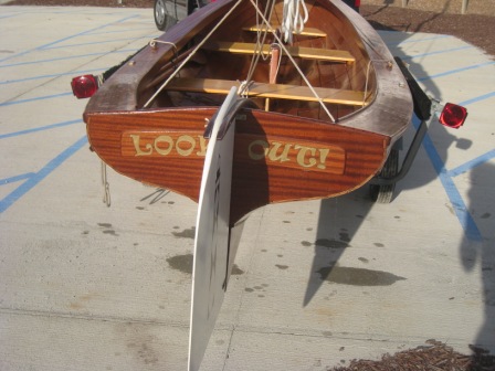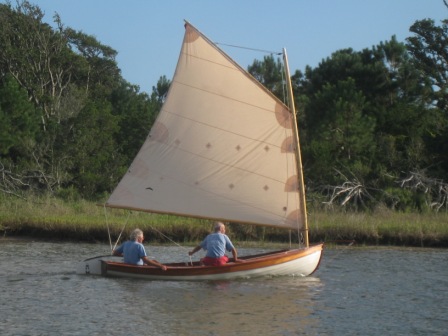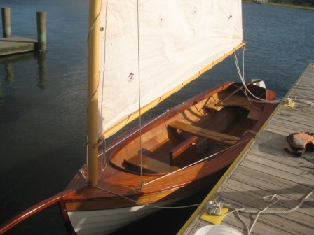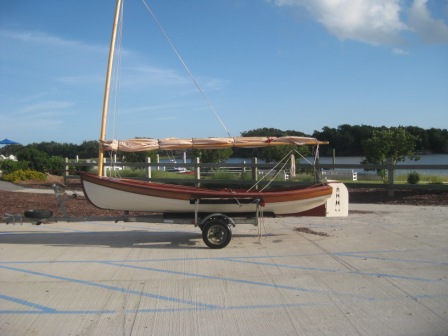 I now have a smaller sail and lowered the center of effort. Additionally, I have made both a new and lighter mast and boom. Now the boat is quite manageable and still achieves hull speed in a modest breeze. The sail is reefable if the wind should get very fresh. She is a sleek looking boat and a nimble sailor too. Photos of the new rig and final boat follow.