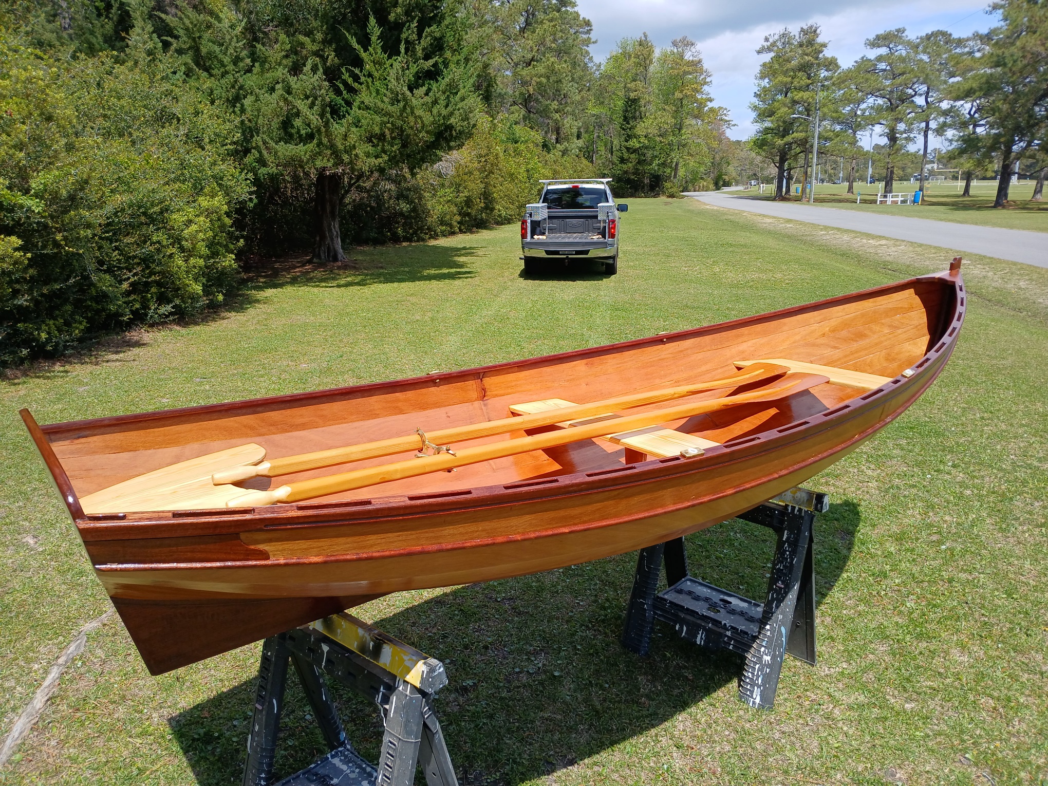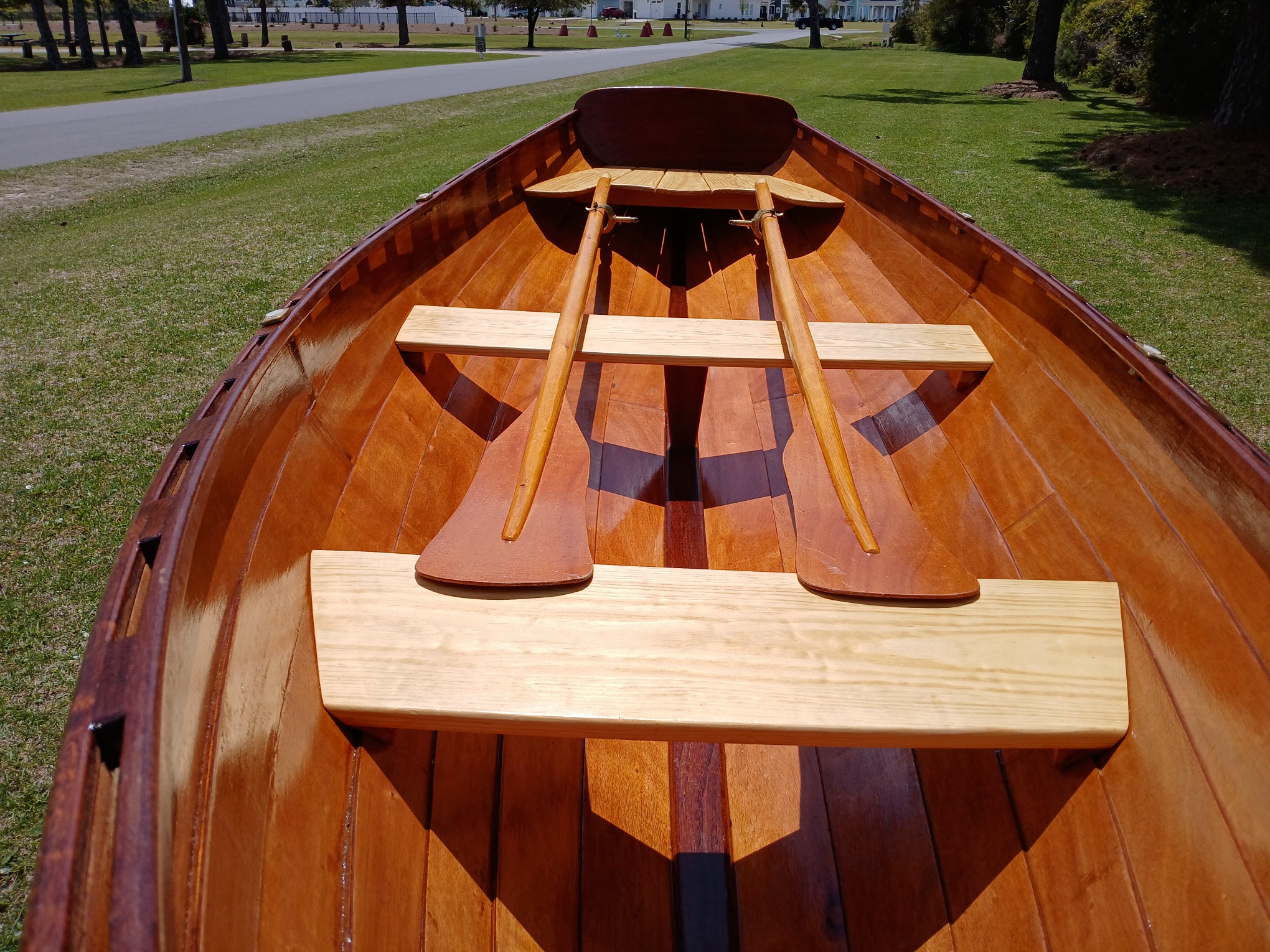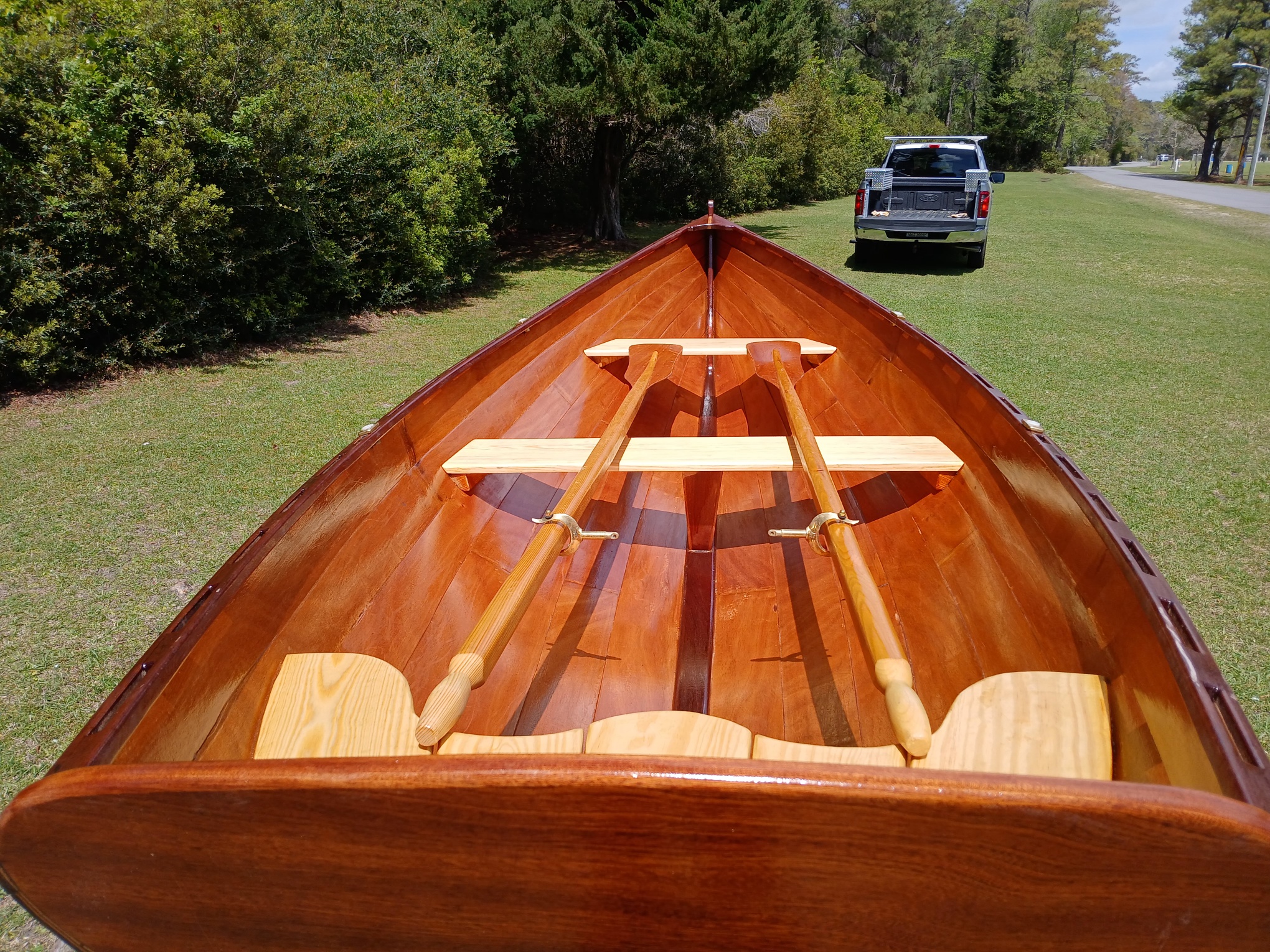 SOLD: This is an Ian Oughtred designed, beautiful, lightweight and easy to row boat. It is built from 6mm okoume marine planking and with sepele mahogany trim work. The seats are yellow pine. I have built several boats similar to this over the years and this is certainly the prettiest. It is 11’9″ long, 48″ in the beam and weights just about 75 lbs. Comes with the oars and is ready to row about.
