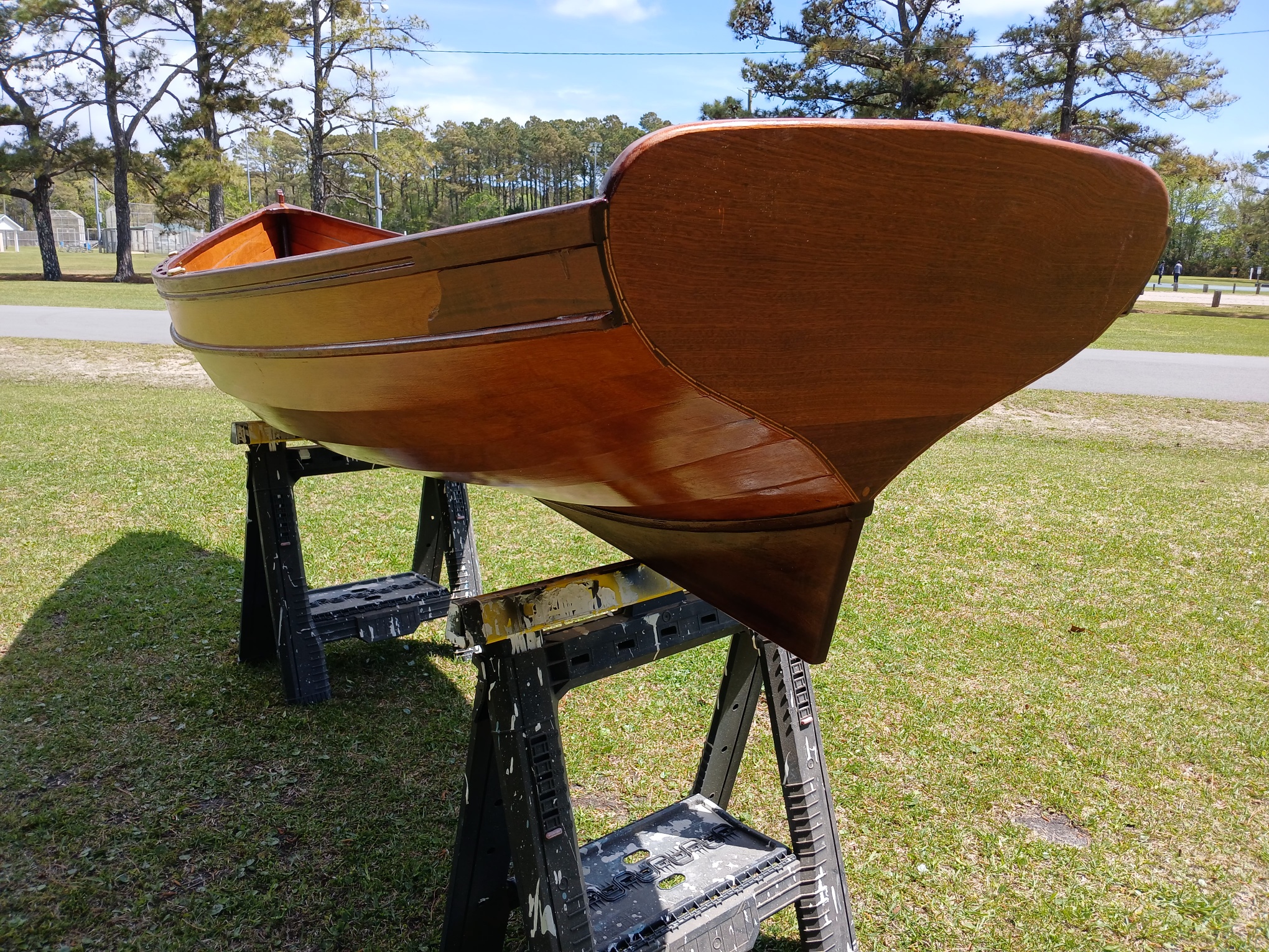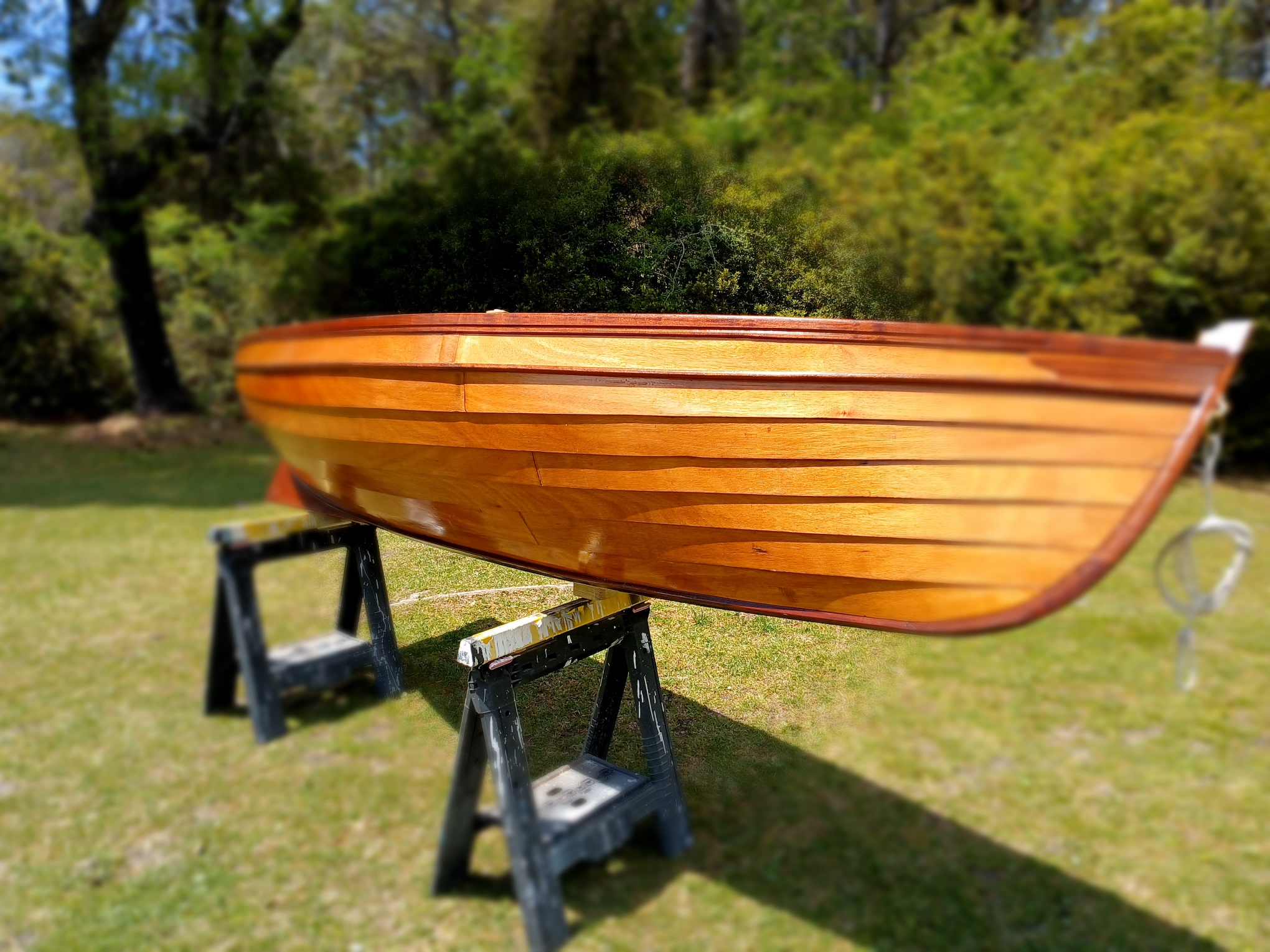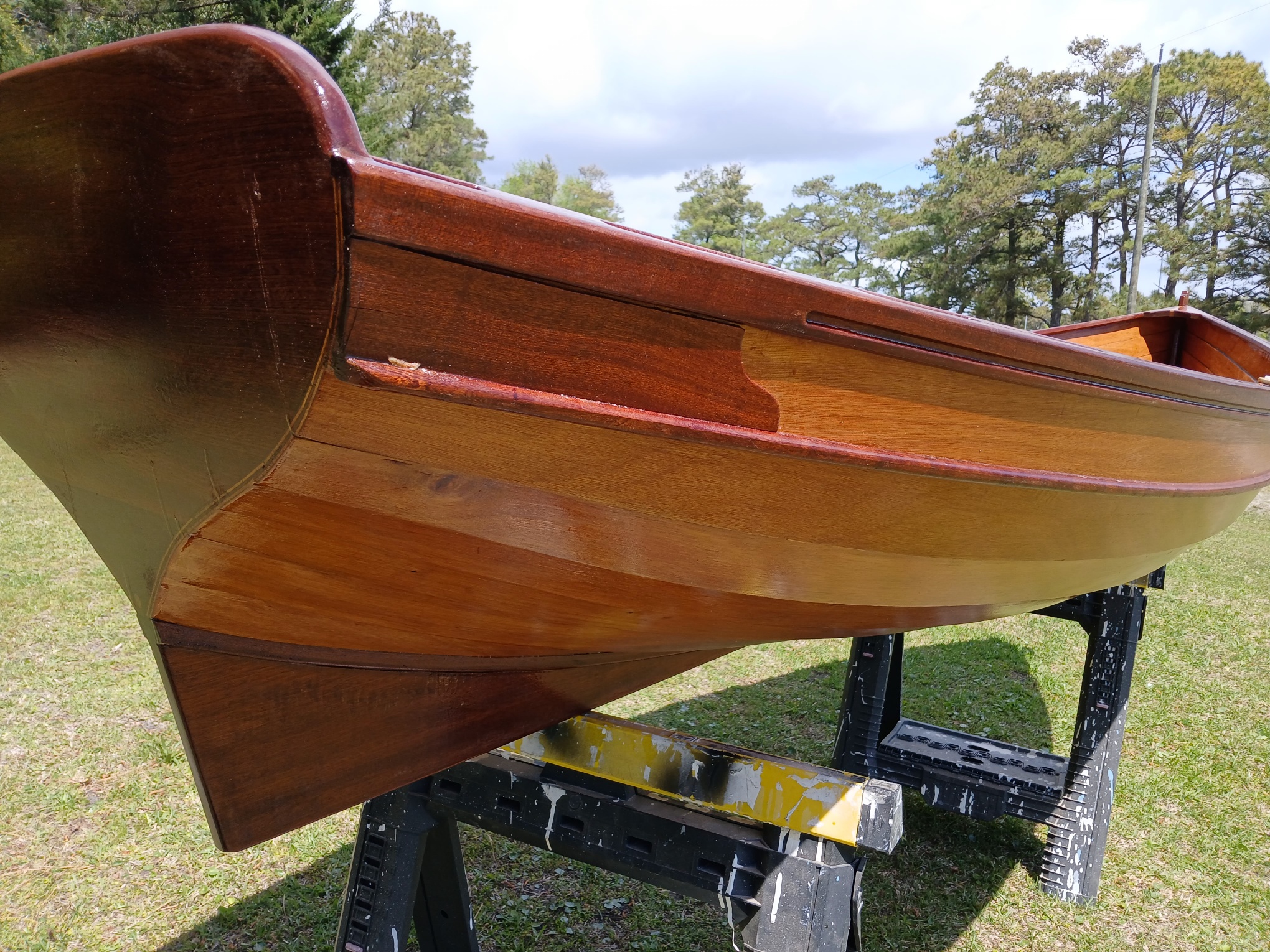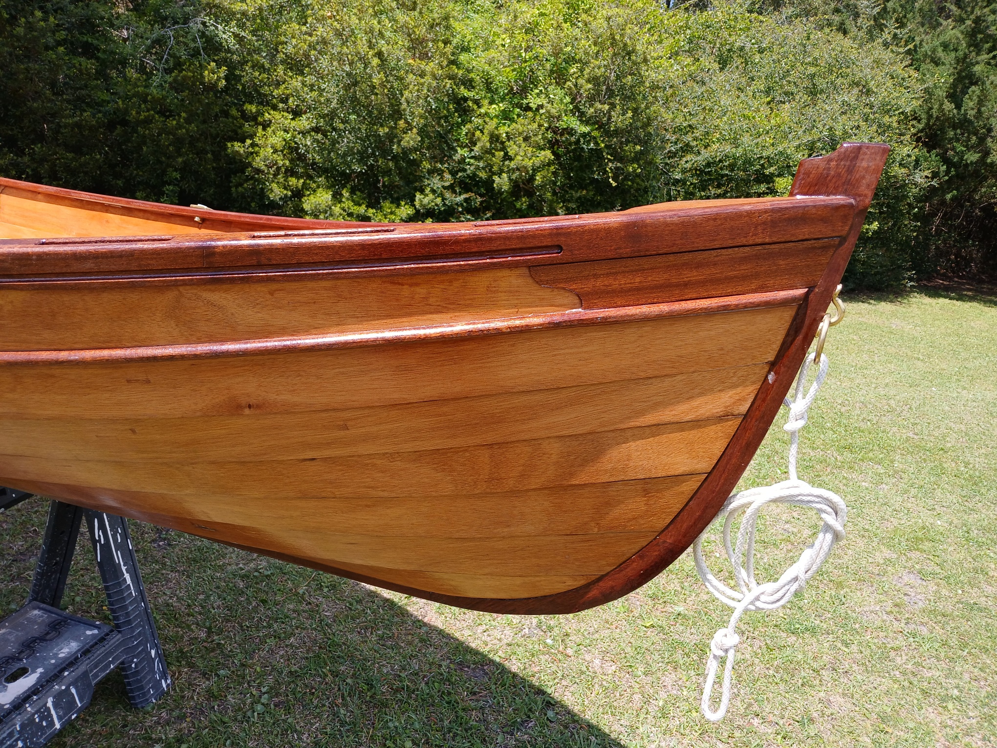 SOLD: This is an Ian Oughtred designed, beautiful, lightweight and easy to row boat. It is built from 6mm okoume marine planking and with sepele mahogany trim work. The seats are yellow pine. I have built several boats similar to this over the years and this is certainly the prettiest. It is 11’9″ long, 48″ in the beam and weights just about 75 lbs. Comes with the oars and is ready to row about.